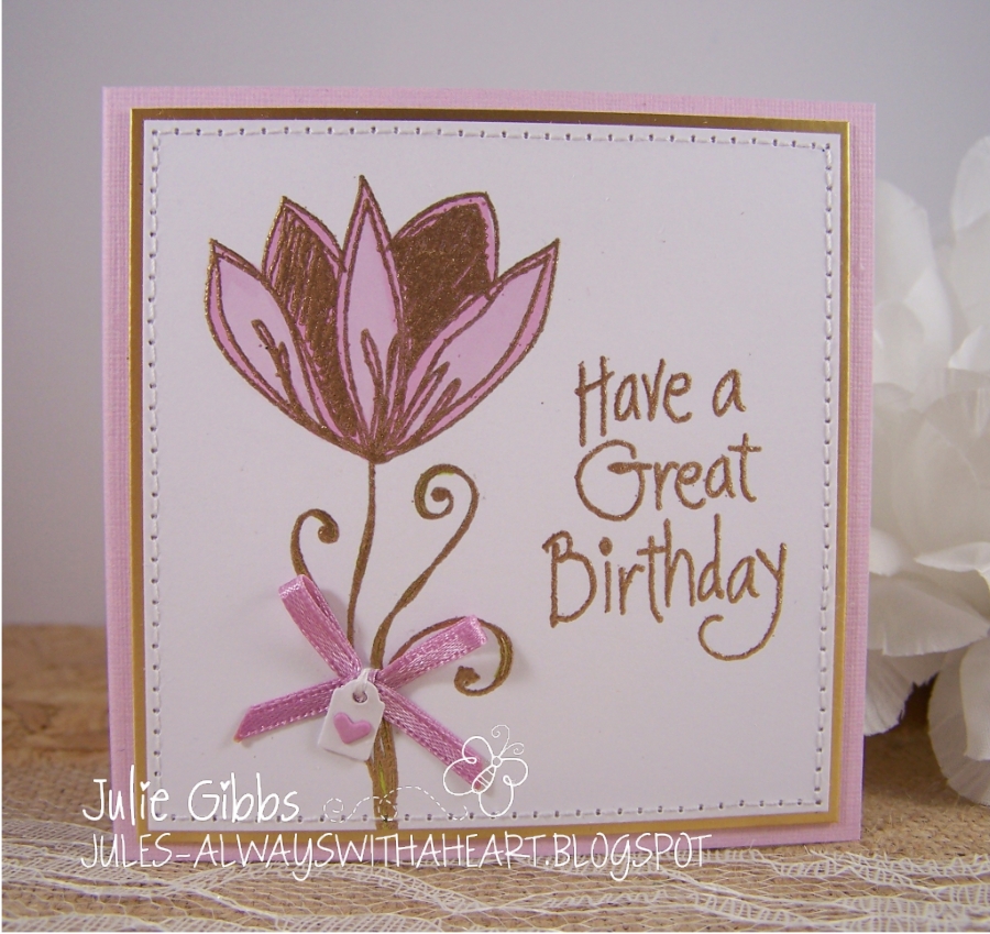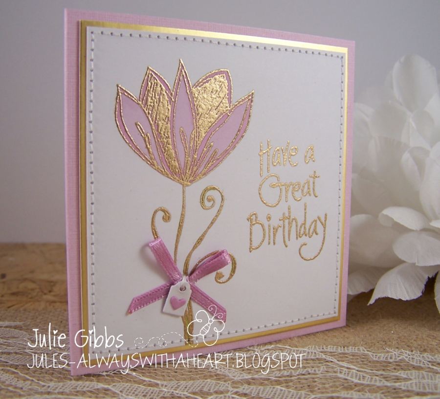 It looks really stunning Jules, far better than the card in the centre. A really lovely image and a very pretty shade of pink which goes so well with teh gold.